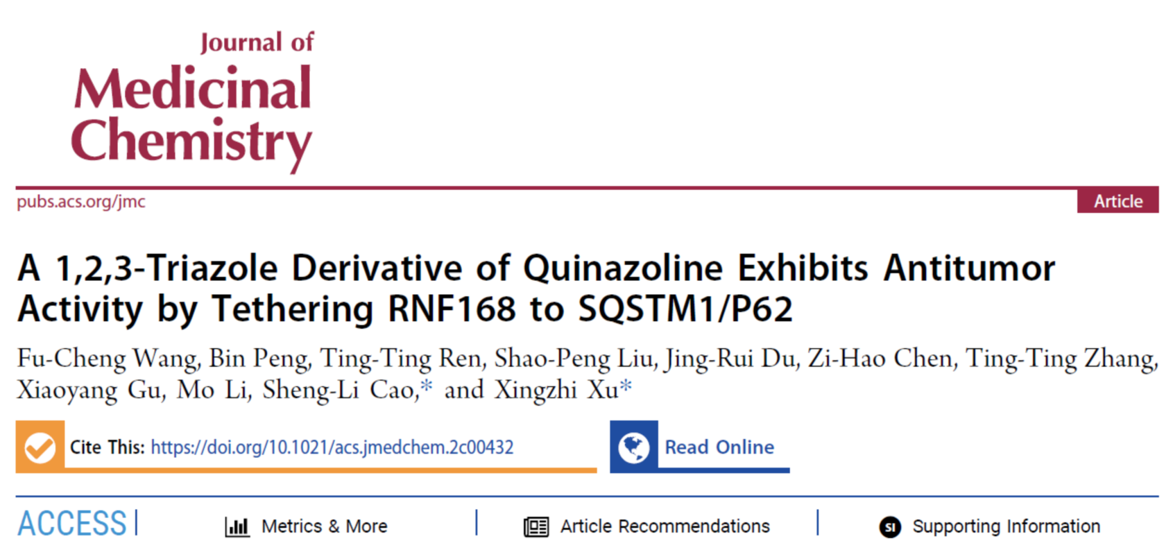 近日,17live 许兴智教授团队与首都师范大学曹胜利教授团队合作完成的研究成果“A 1,2,3-triazole derivative of quinazoline exhibits antitumor activity by tethering RNF168 to SQSTM1/P62”在药物化学顶级学术期刊《Journal of Medicinal Chemistry》发表。许兴智教授团队博士后王甫城为第一作者,17live 为第一署名单位,许兴智教授和曹胜利教授为共同通讯作者。