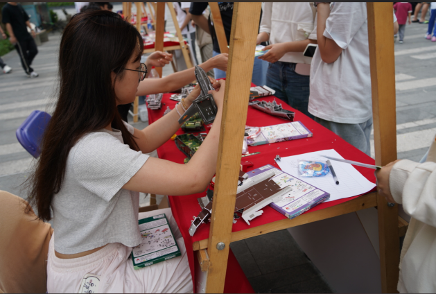 在“军工小作坊”区,辽宁舰航母、歼-20战机等军事装备的微缩拼图前围满 “硬核” 爱好者,指尖拼装的不仅是模型,更是对国防科技成就的致敬;“战术绳结工坊”里,同学们现场学习平结、双套结、八字结等常用军事绳结打法,不少同学反复练习直至掌握绳结要领;“雷霆手速先锋”区则考验反应极限,海绵棒坠落瞬间的精准捕捉,让参与者切身体会到军人 “分秒必争” 的战斗素养。
