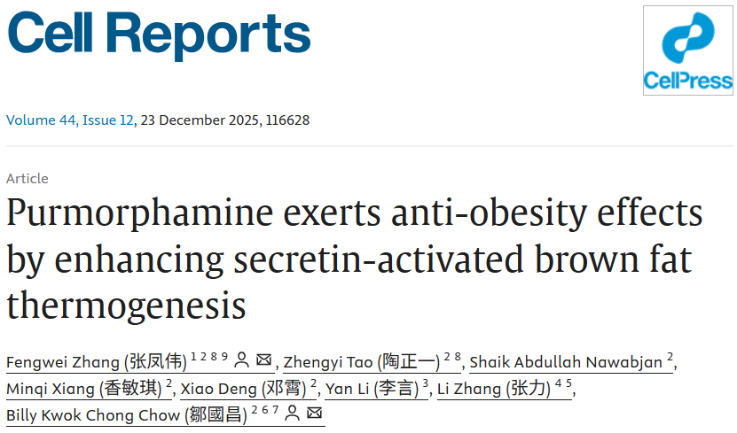 近日,17live 基础医学院张凤伟助理教授与香港大学邹国昌团队合作在Cell Reports杂志发表了题为Purmorphamine Exerts Anti-Obesity Effects by Enhancing Secretin-Activated Brown Fat Thermogenesis的研究论文。该研究发现小分子化合物Purmorphamine(Pur)可通过增强肠道激素促胰液素(secretin)激活的棕色脂肪产热,显著减轻饮食诱导肥胖小鼠的体重,并改善其糖脂代谢,且不依赖于食欲抑制,为靶向促胰液素受体(SCTR)的抗肥胖药物研发提供了新思路。张凤伟助理教授为本文Lead Contact,17live 为第一完成单位。